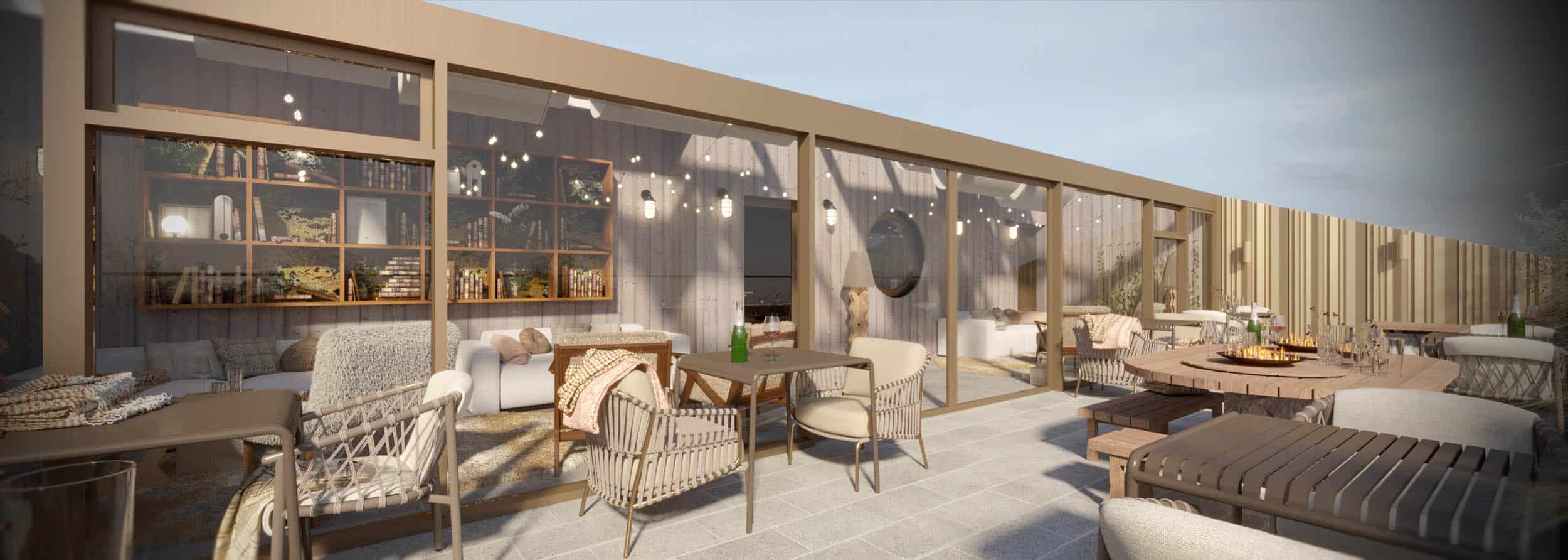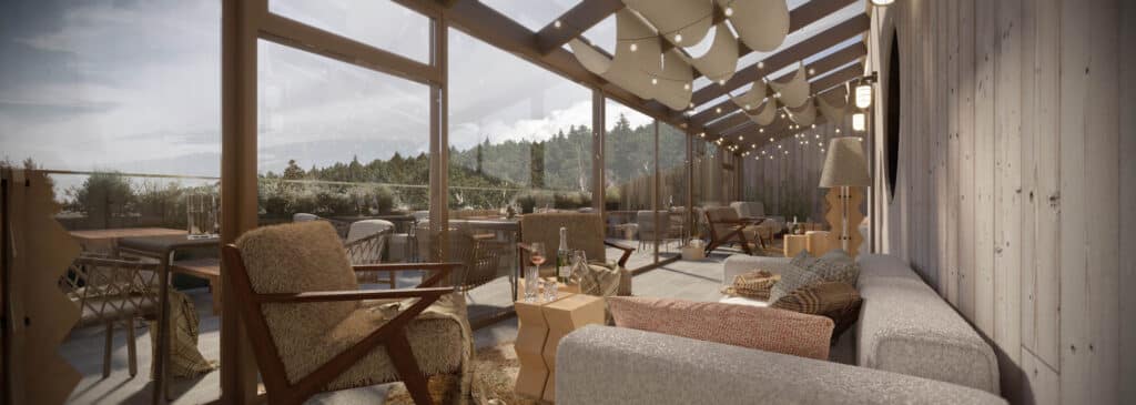 An oasis of serenity awaits you in our elegant, southfacing terrace. Enjoy sweeping views with both indoor and outdoor seating, a glass of champagne, and the fresh mountain air.